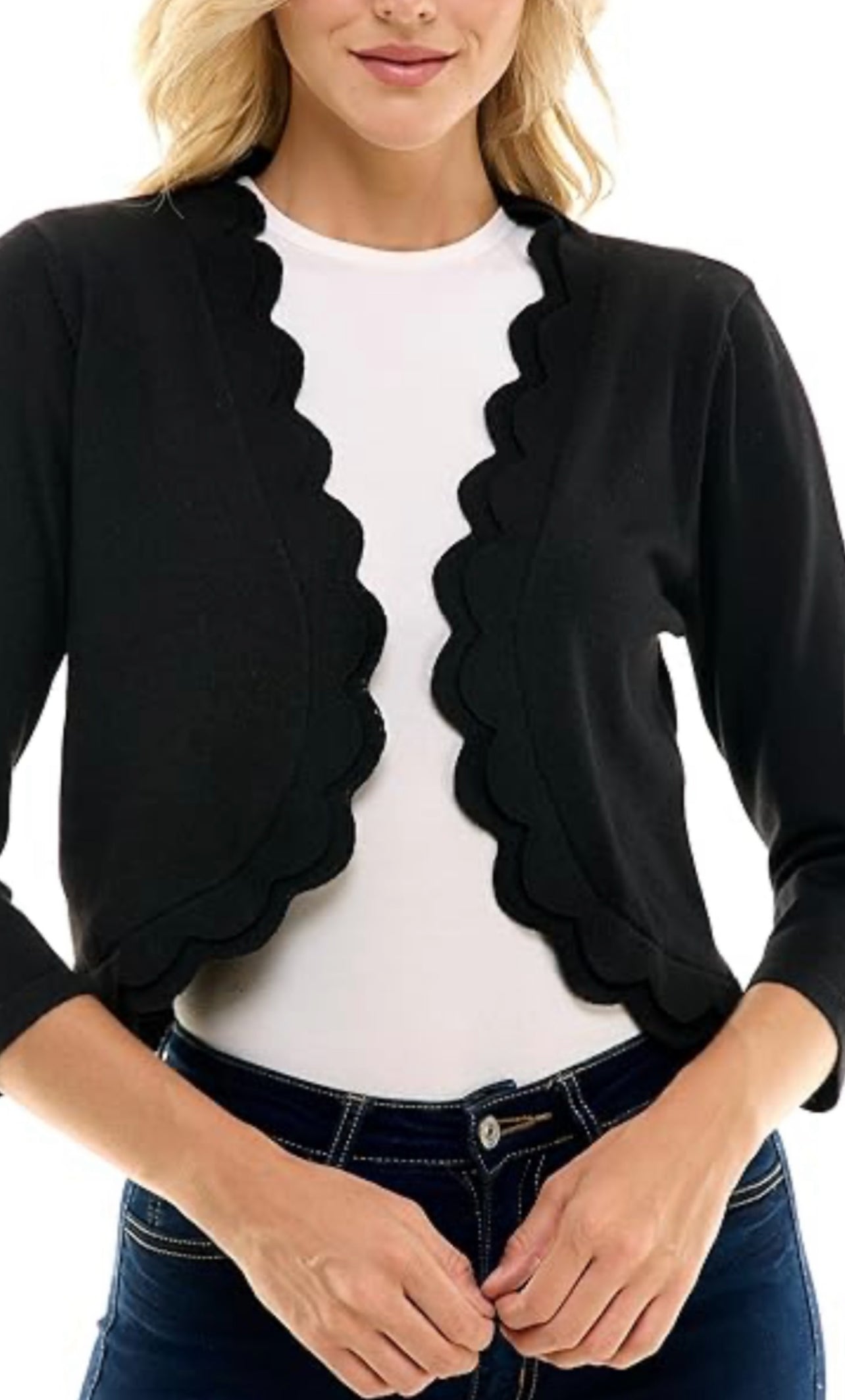 This cute little cardigan is perfect for cooler weather or in a cool building. It had scalloped opening and 3/4 length sleeves. Pairs well with jeans for a casual look or can be dressed up