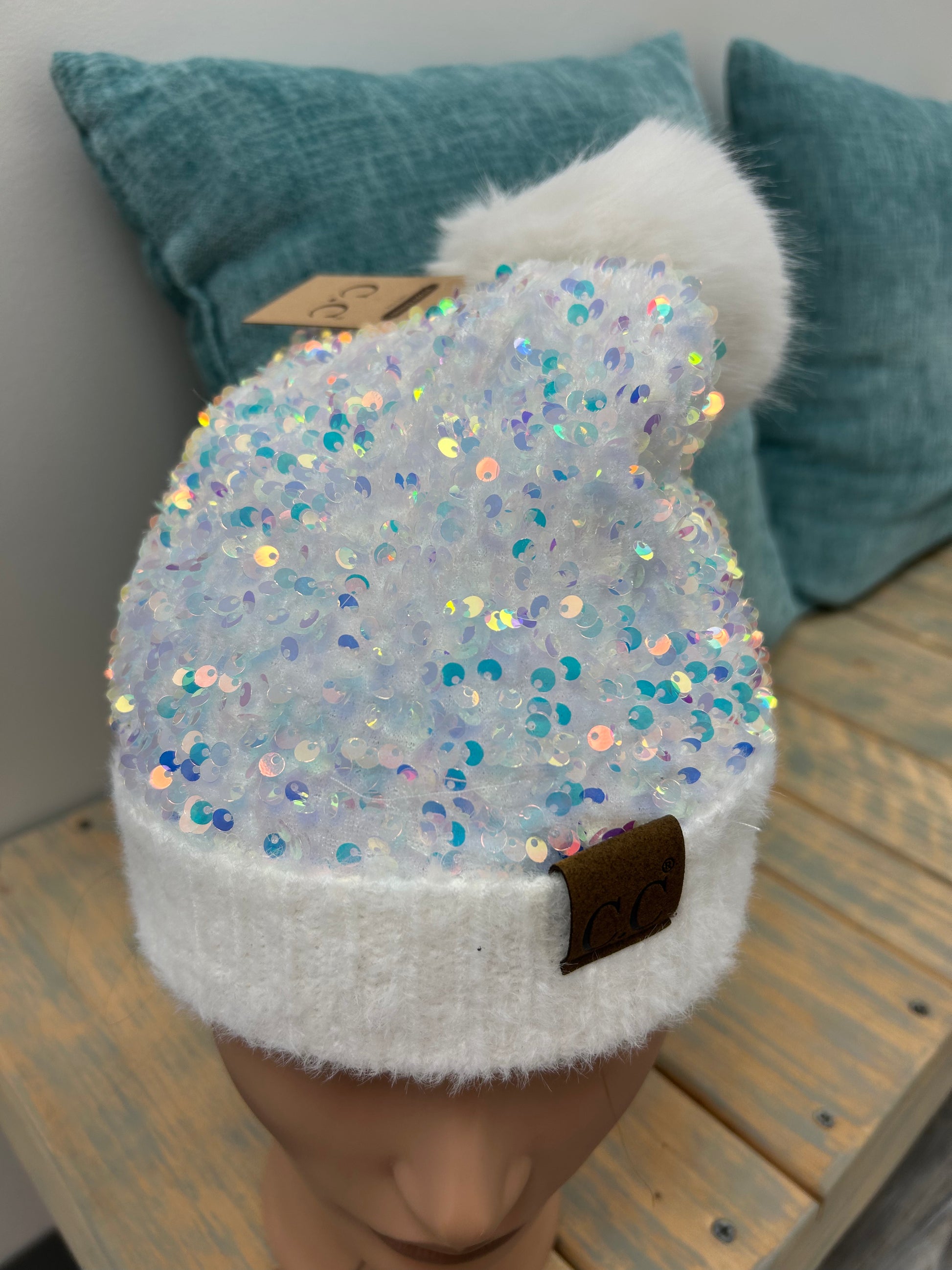 This is an adorable white sequin beanie