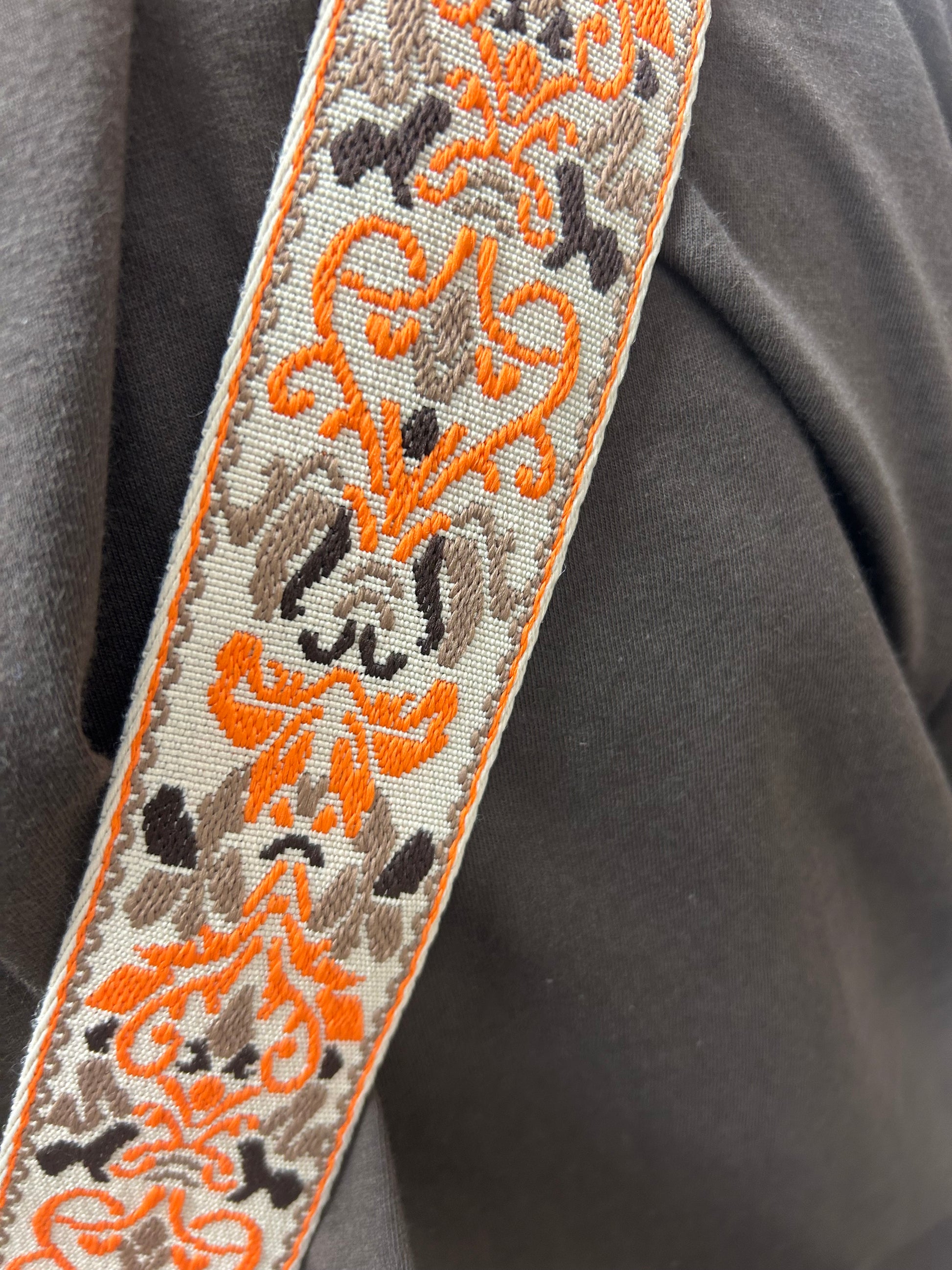 These adorable crossbody bags come with 2 guitar straps one print and one solid. It has a snap closure and one front pocket.