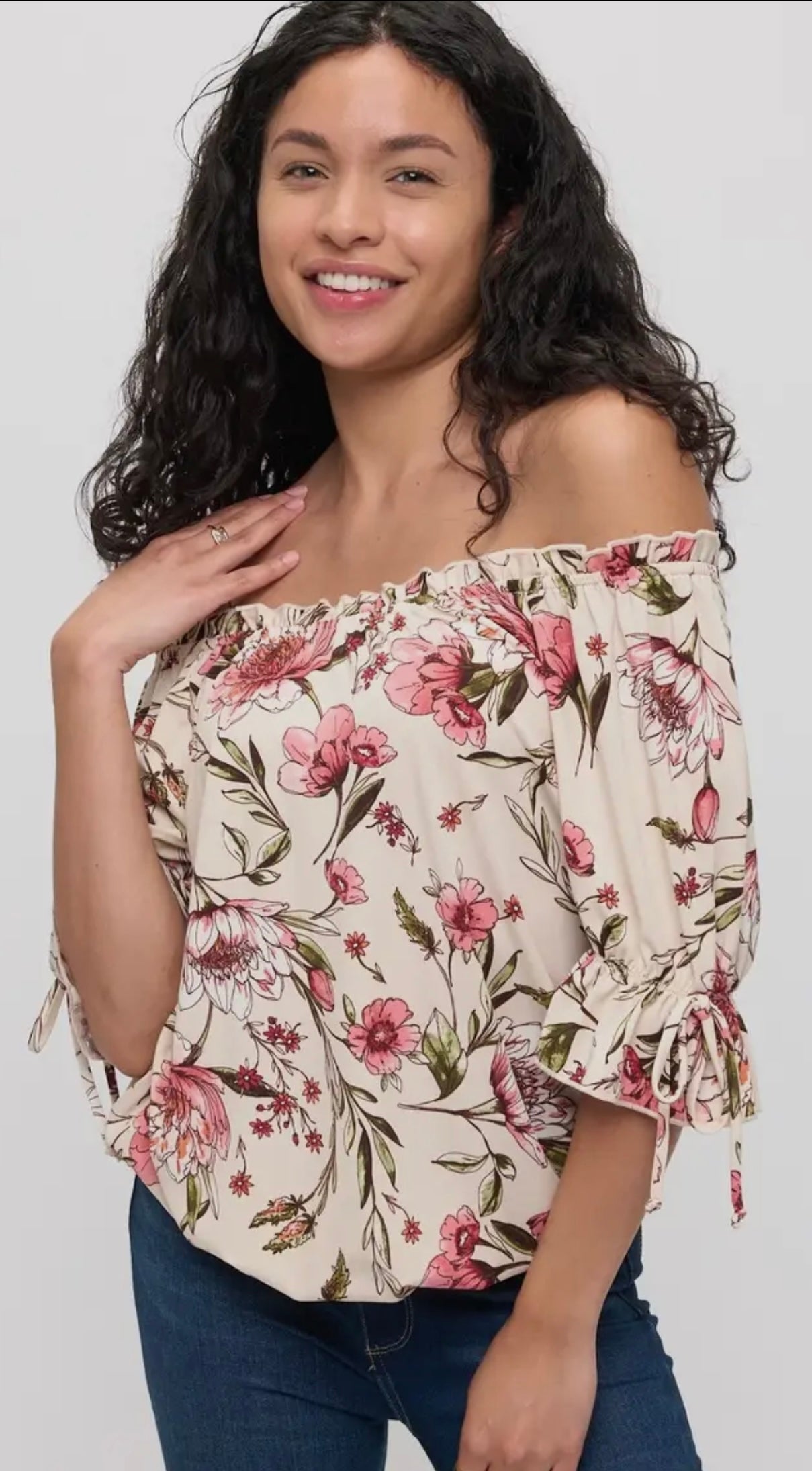 Floral Ruffle Neck Tie Sleeve Peasant Top
